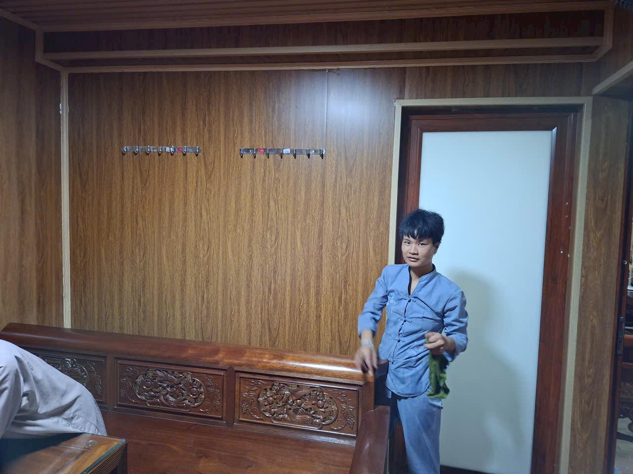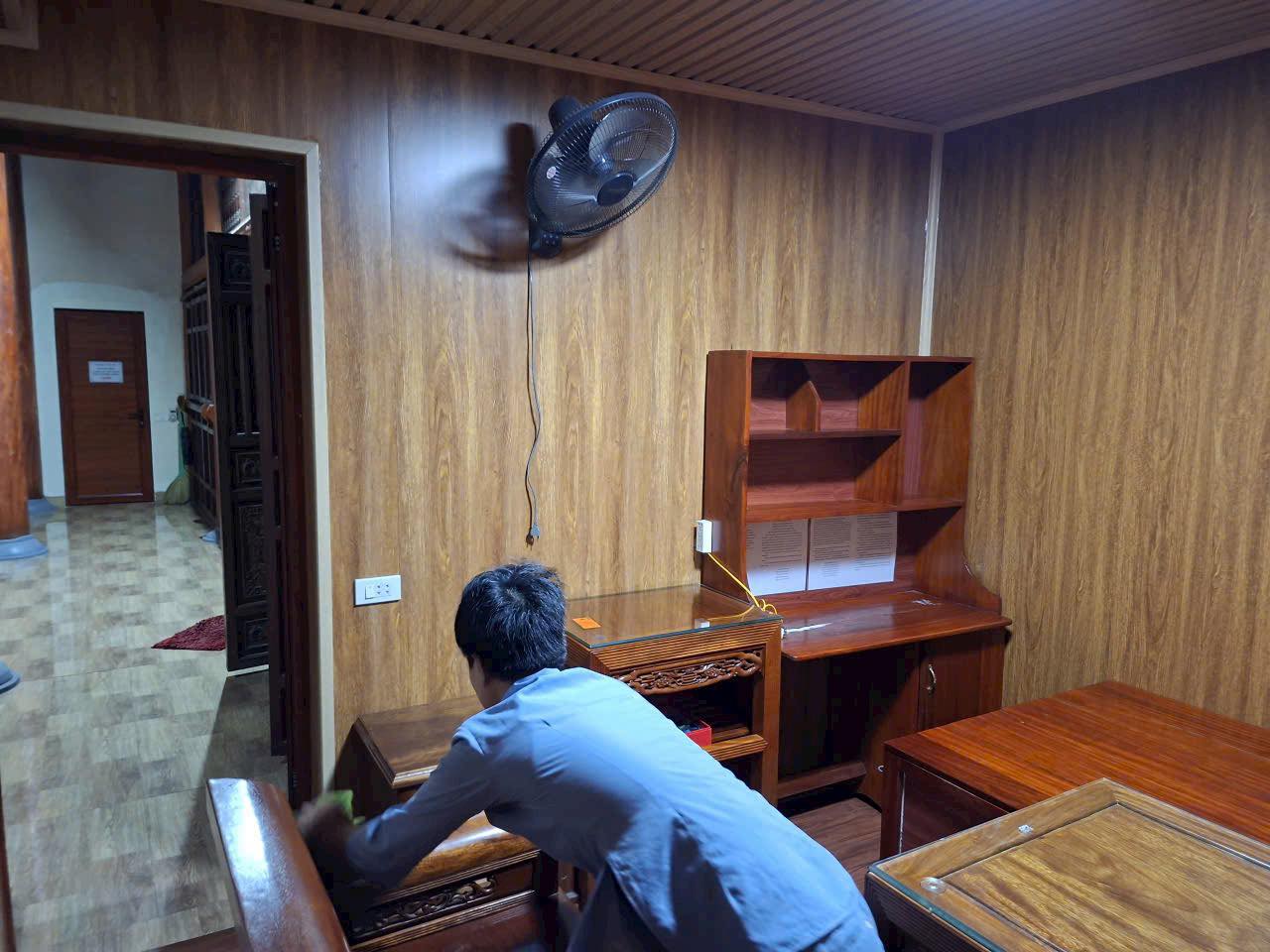 Bước 3: Ốp tấm nhựa nano vân gỗ, canh chỉnh đường vân hoàn hảo tạo cảm giác tự nhiên như gỗ thật.