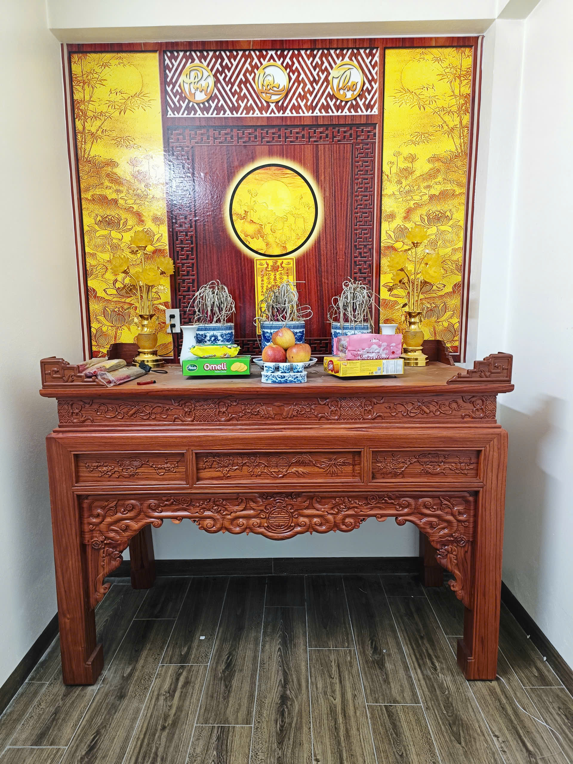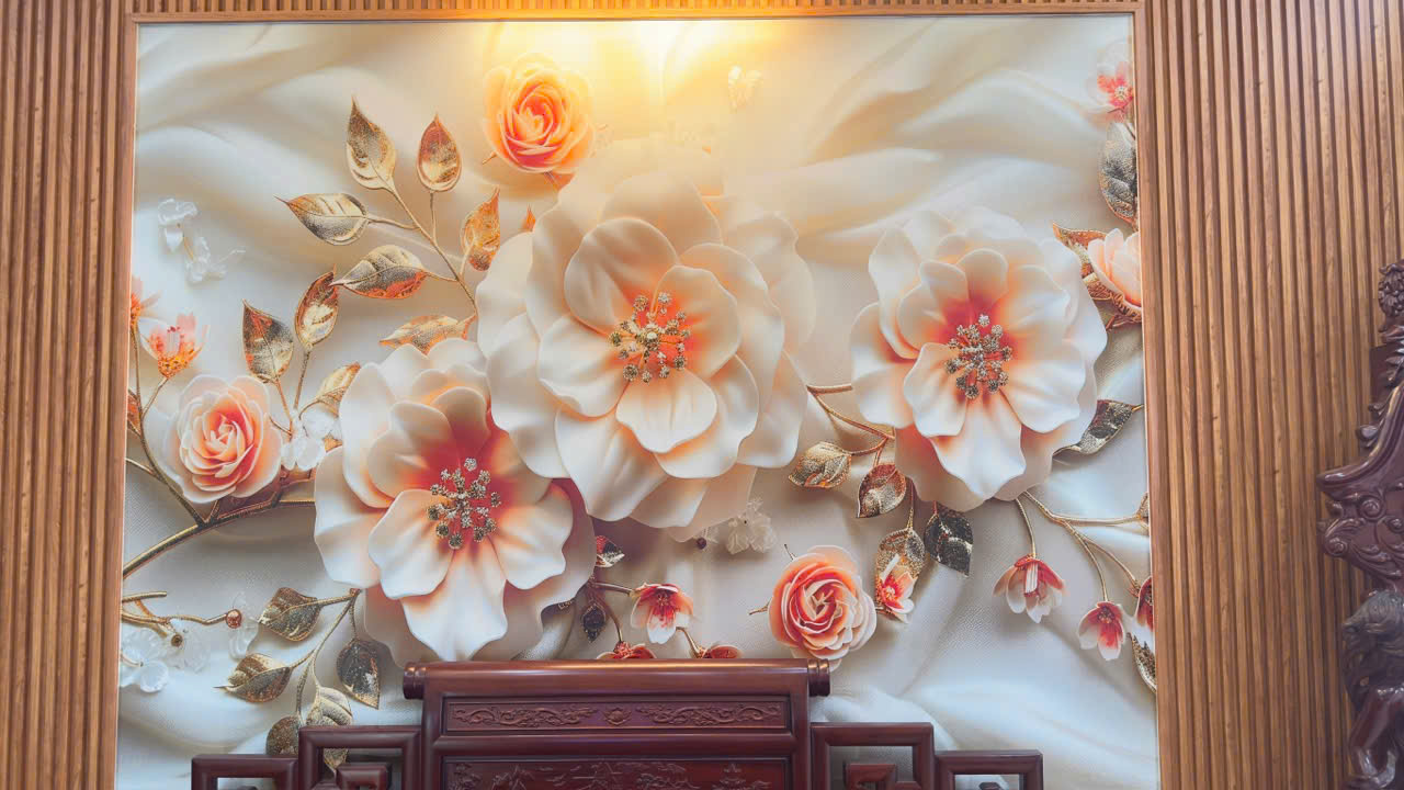 • Tranh dán tường phòng thờ: họa tiết hoa sen, tranh trúc chỉ, tranh mang ý nghĩa phong thủy – tâm linh.